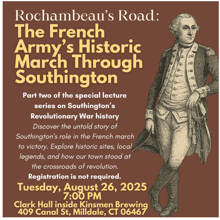 The society suggests that people may want to consider an alternative event, “History Pints: Rochambeau in Southington,” being held on Aug. 26 at 7 p.m. The program will be held at Kinsmen Brewing Company, 409 Canal St., Milldale. The is Part II of the Barnes Museum’s American Revolution lecture series, focusing on the dramatic journey of General Rochambeau and the French army, right through the heart of Southington in June 1781. The program is free but a $10 donation is suggested.